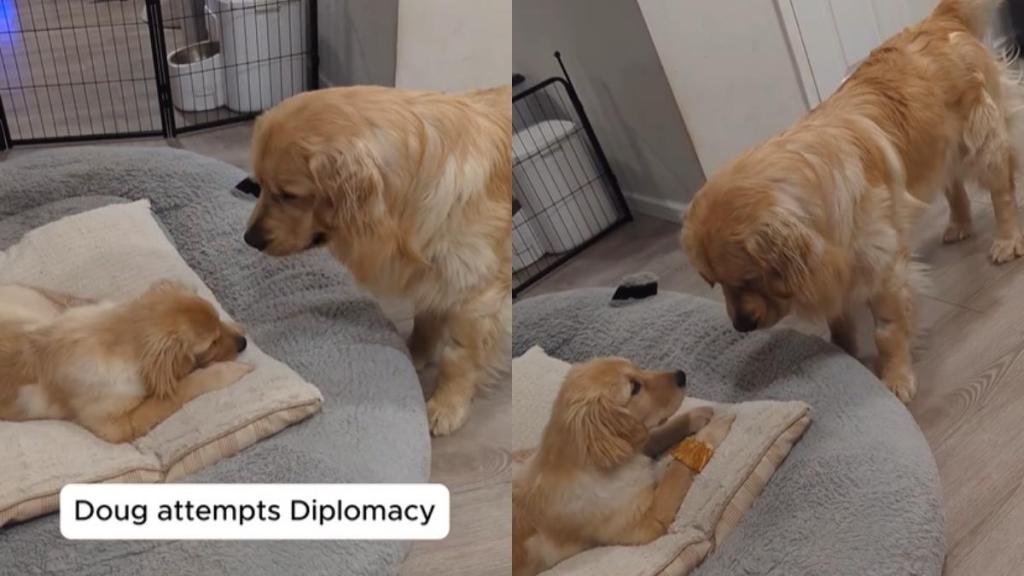 In an adorable dog video on Instagram, a Golden Retriever puppy makes it clear to her big brother Doug that she cannot share treats. It shows the elder pup standing in front of the younger one, who is comfortably lying on a big dog bed. The latter is holding a piece of a snack inside her mouth, which seems to be what Doug is after.
