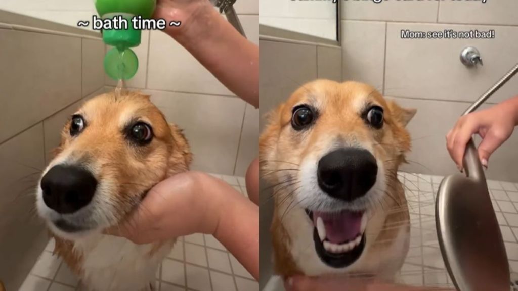 In an Instagram video from user @suckerforsammy, Sammy the Corgi prepares for his bath, but something feels off. He stands in an indoor shower, eyes wide and tongue out, as text across the screen reads, “POV: this wasn’t on Sammy’s bingo card for today.” Turns out, Sammy usually bathes outdoors. His owner gently reassures him, saying, “See it’s not bad,” but the Corgi looks surprised throughout.