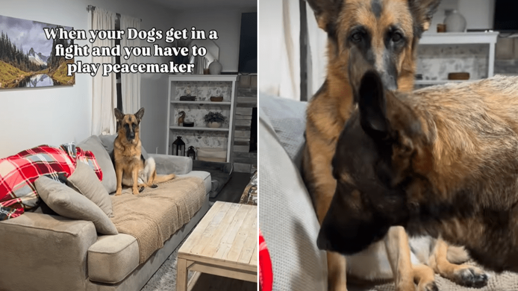 This video captures two German Shepherds dealing with the aftermath of an alleged fight. It is clear as day that they are not speaking to each other. Absolutely cannot stand the sight of the other, in fact. And then the video shows dad trying to act as the mediator in this awkward dog fight.