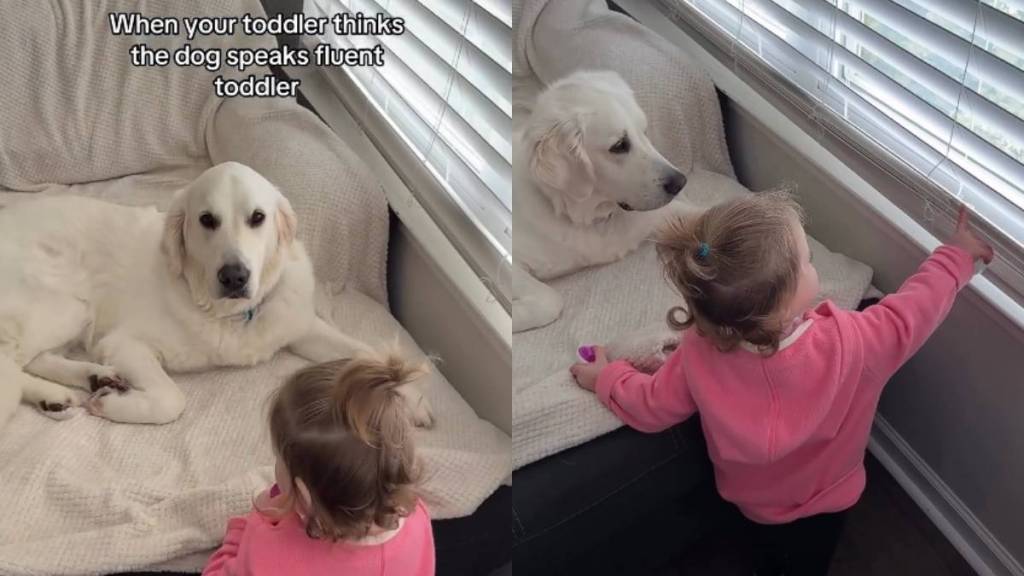 Toddler appears to communicate with a Golden Retriever in cute video