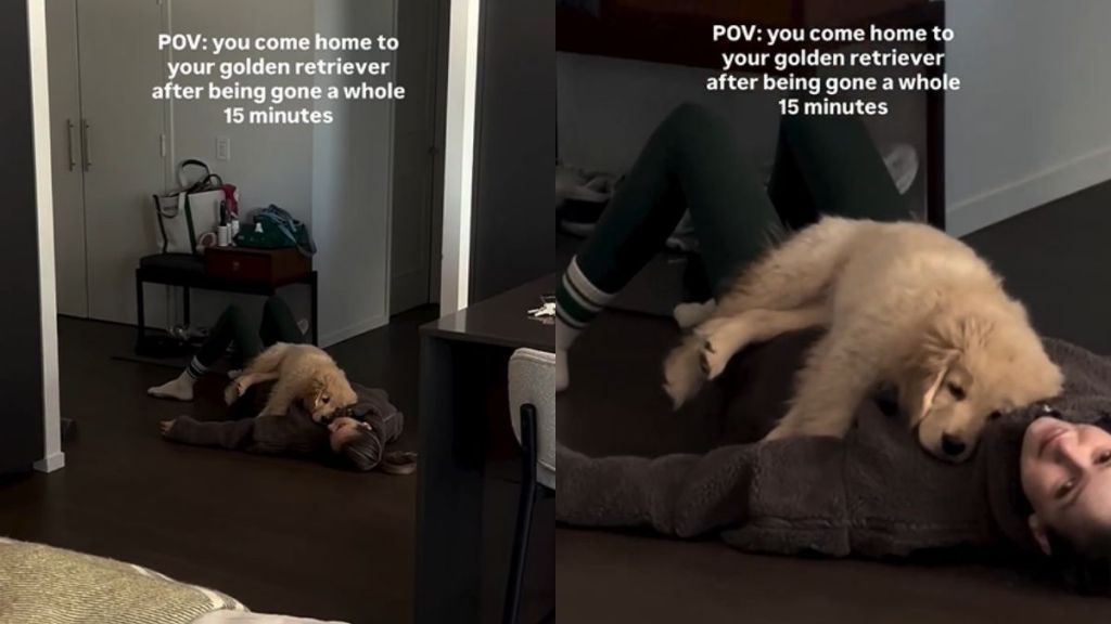 The video does not show the Golden Retriever puppy greeting his owner at the door and moving on with his day. Instead, he goes all in. He climbs onto her as she lies on the floor and tucks his face in close like he needs to make sure she does not leave again.
