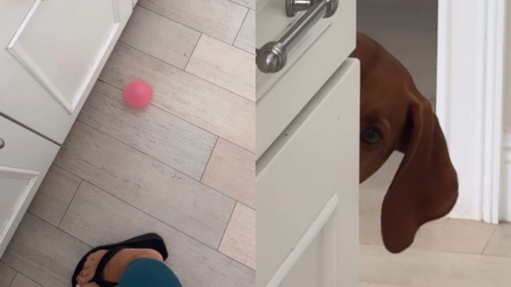 A Vizsla named Zeena has a unique way of dropping the ball near her owner while playing fetch, and this hilarious Instagram dog video from @zeus_and_zeena_ captures it all. Zeena’s owner films a pink ball on the kitchen floor and narrates what always happens next. She tells the audience, “This cracks me up every time,” and the viewers agree as she explains how the pup in the clip “comes out into the kitchen, she drops her ball.”