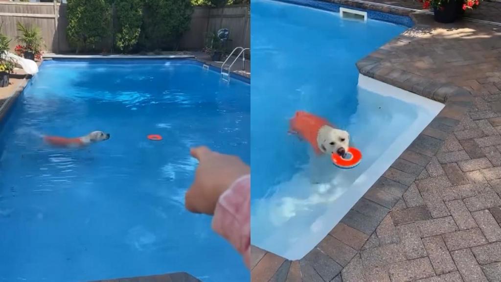 Then, she tosses the frisbee into the pool while Odin swims, telling him, “Odin, get your toy.” She points him toward the floating toy, prompting Odin to adjust course, turn to the frisbee, paddle over, and clamp the toy in his mouth, earning him a “good boy” from his mom.
